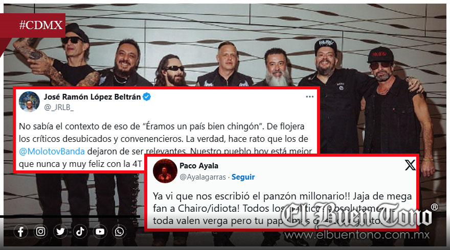 El 2 de noviembre, José Ramón López Beltrán, hijo del presidente Andrés Manuel López Obrador, respondió desde su cuenta en X, calificando a la banda de irrelevante y defendiendo la gestión de la Cuarta Transformación. “De flojera los críticos desubicados y convenencieros. La verdad, hace rato que los de Molotov dejaron de ser relevantes. Nuestro pueblo hoy está mejor que nunca y muy feliz con la 4T”, escribió.
