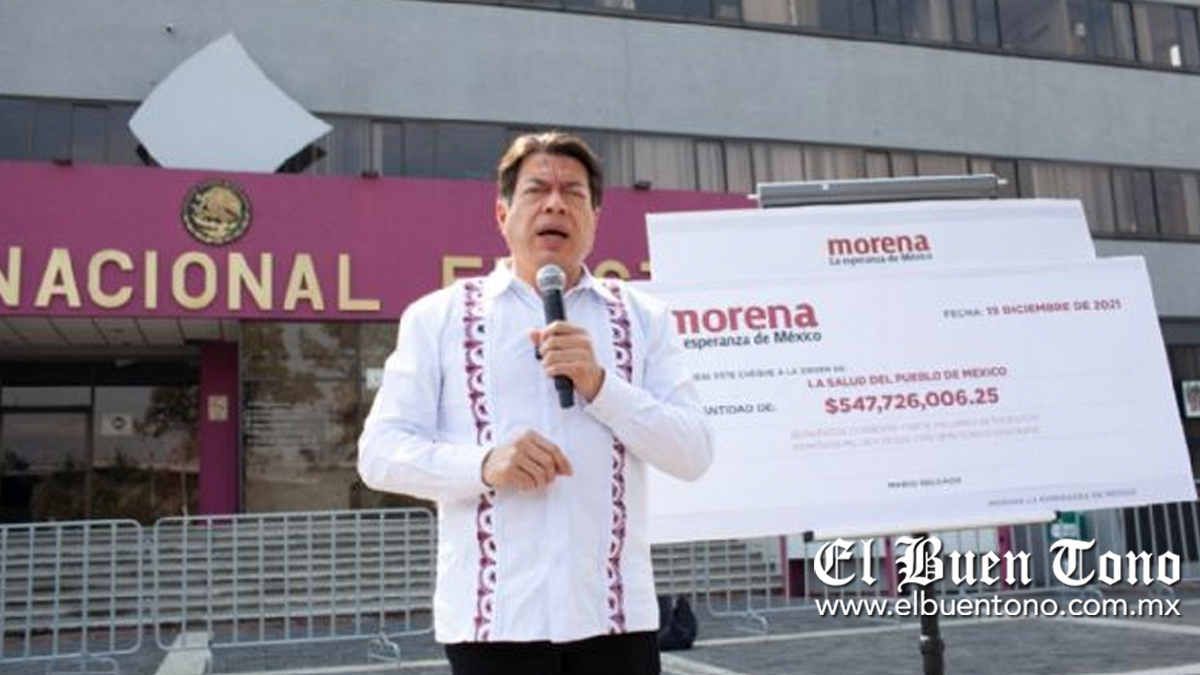 CDMX.- Mario Delgado, líder nacional del Movimiento de Regeneración Nacional (Morena) entregó un cheque al Instituto Nacional Electoral (INE) por 547.7 millones de pesos para comprar vacunas contra Covid-19 .