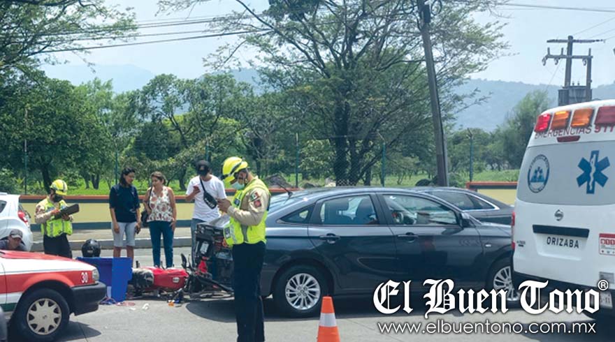 Orizaba.- En medio de un automóvil y un vehículo de alquiler quedó un motociclista luego de chocar entre sí en el semáforo ubicado en la avenida Cri-Crí frente a Plaza Valle.
