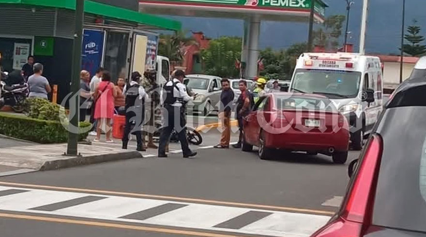 Orizaba, Ver.- Un motociclista resultó lesionado al impactarse contra un automóvil Honda Accord, este viernes por la tarde en la avenida Roble esquina con avenida Cri Cri o Circunvalación Norte, en la entrada de la Plaza comercial El Espinal.