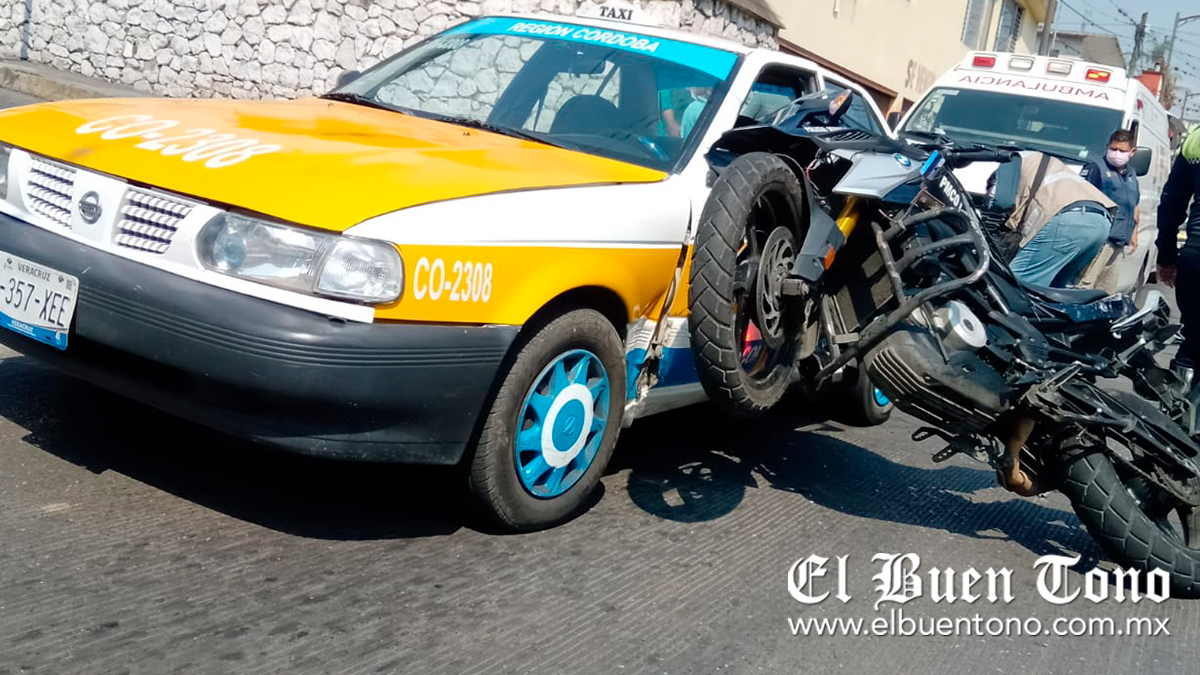 Córdoba.- Un motopatrullero de la Policía Municipal se impactó contra el taxi marcado con el número CO-2308, en la colonia Centro, teniendo que intervenir autoridades de Tránsito Municipal para tomar conocimiento y posteriormente deslindar responsabilidades.