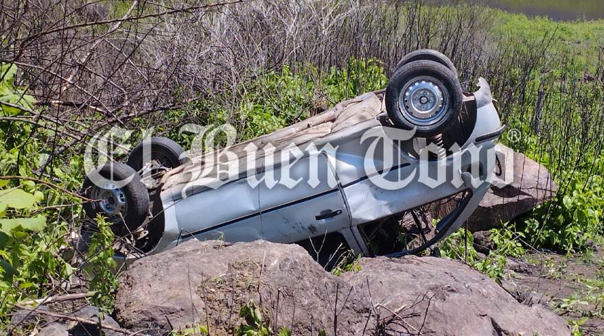 Después de enviar al barranco al automóvil, el conductor del tráiler perdió el control y chocó contra un talud de tierra, volcando y quedando atravesado sobre la cinta de rodamiento.
