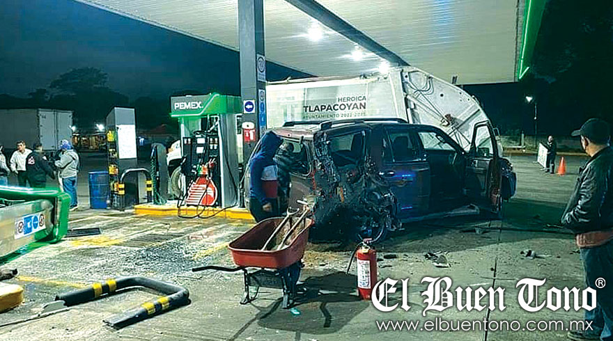 En tanto, la unidad continuó su curso e impactó a una camioneta Ford Expedition color vino, placas TMV-1298 del estado de Oaxaca, que cargaba combustible, a su vez esta derribó una de las bombas dispensadoras de combustible, para terminar la unidad incrustada sobre las oficinas de la gasolinera.