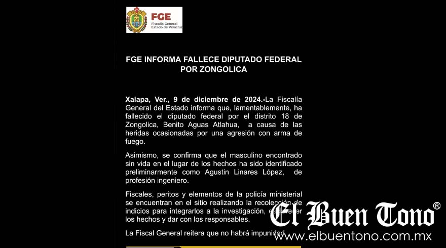 Zongolica, Ver – El diputado federal por el distrito 18, Benito Aguas Atlahua, del Partido Verde Ecologista, murió alrededor de las 23:00 horas, luego de ser agredido por disparos de arma de fuego en la comunidad Tepenacaxtla.