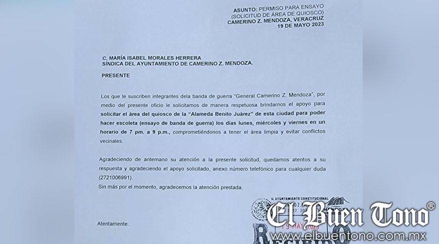 Ciudad Mendoza.- El ayuntamiento de Ciudad Mendoza ha negado a la banda de guerra “General Camerino Z. Mendoza” poder ensayar en la Alameda para el concurso nacional que están próximos a acudir, bajo el argumento de que el ruido molesta a los vecinos y nuevos comerciantes que se instalaran en la periferia de ese parque.
