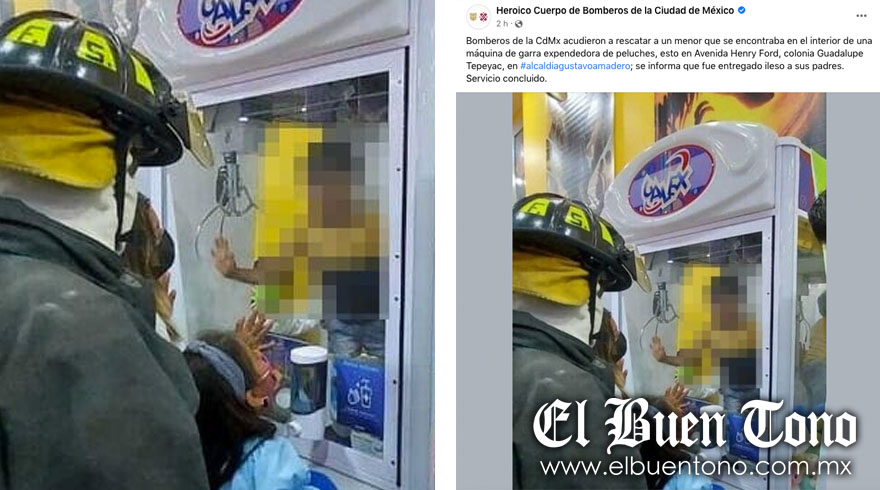 Un niño fue rescatado por bomberos cuando estaba al interior de una máquina expendedora de muñecos de peluches. Ocurrió en la Ciudad de México.