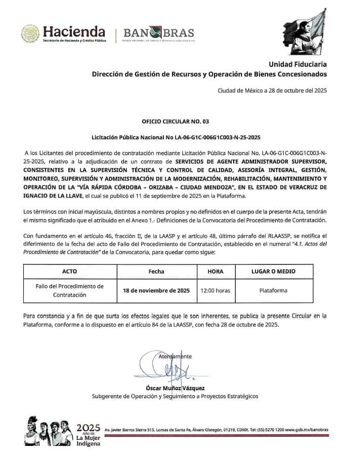 Orizaba.- De acuerdo a la plataforma comprasmx.buengobierno.gob.mx, la licitación pública nacional número LA-06-G1C-06G1-003-N-25-2025, para agente administrador supervisor para la vía rápida Córdoba– Orizaba – Ciudad Mendoza, la fecha del fallo cambio para el 18 de noviembre de 2025, y el inicio de contrato será al siguiente día del resultado.