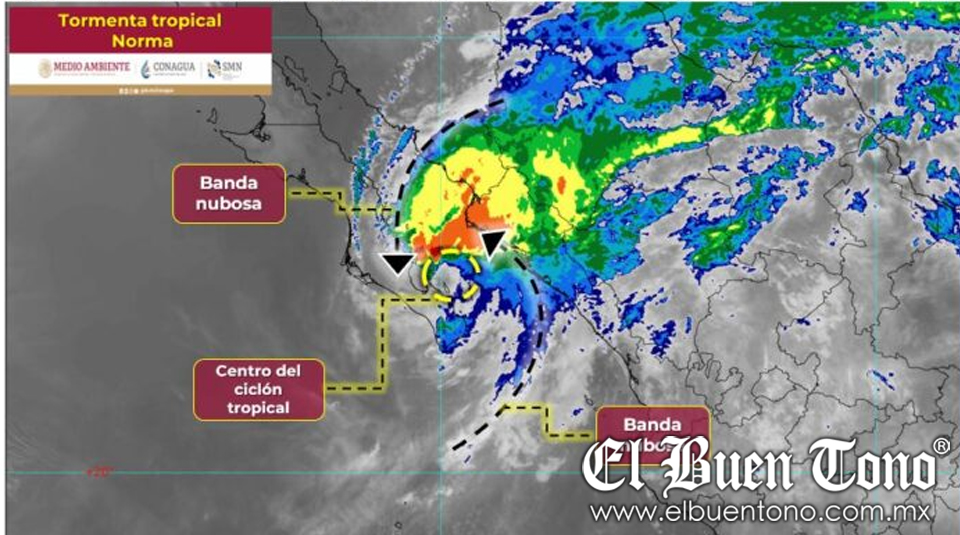 A las 6:15 horas, “Norma” se ubicaba a unos 85 kilómetros (km) al noreste de La Paz, Baja California Sur, y a 145 km al sur-suroeste de Los Mochis, Sinaloa. El SMN, parte de la Comisión Nacional del Agua (Conagua), ha mantenido la zona de prevención por efectos de tormenta tropical desde Santa Fe hasta San Evaristo en Baja California Sur, y desde Huatabampito hasta Mazatlán en Sinaloa.