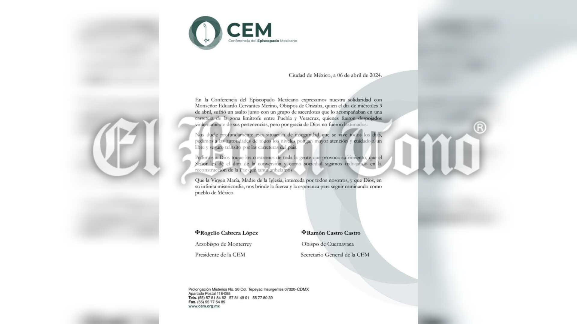 La Conferencia del Episcopado Mexicano (CEM) emitió un comunicado expresando su solidaridad con las víctimas del asalto, incluido el Obispo de Orizaba y los dos presbíteros, quienes fueron despojados violentamente de sus pertenencias, al igual que numerosas personas más.