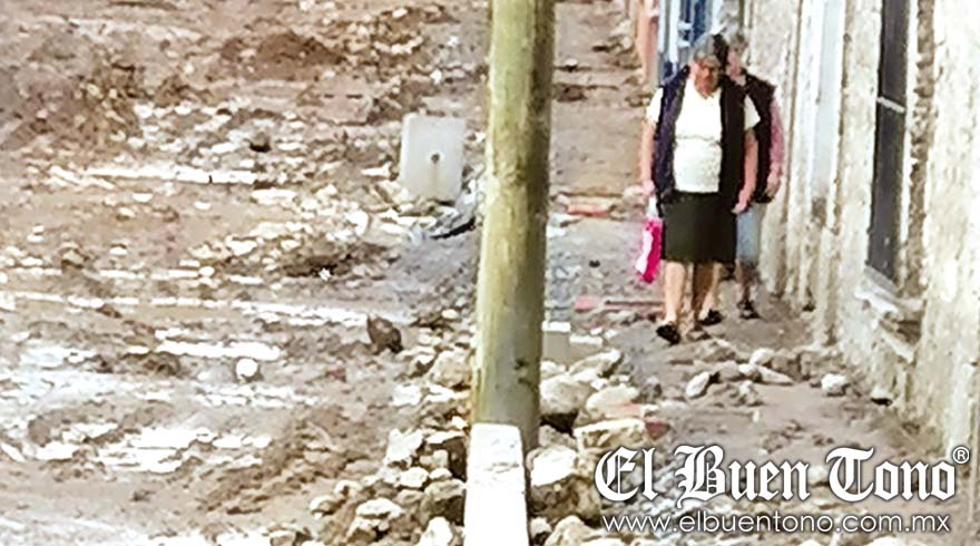 Coscomate-pec.- Habitantes de la calle Vicente Guerrero, de la cabecera municipal dijeron estar hartos de caminar entre lodo y escombros, debido a la lentitud de los trabajos que realiza el Ayuntamiento en el área.