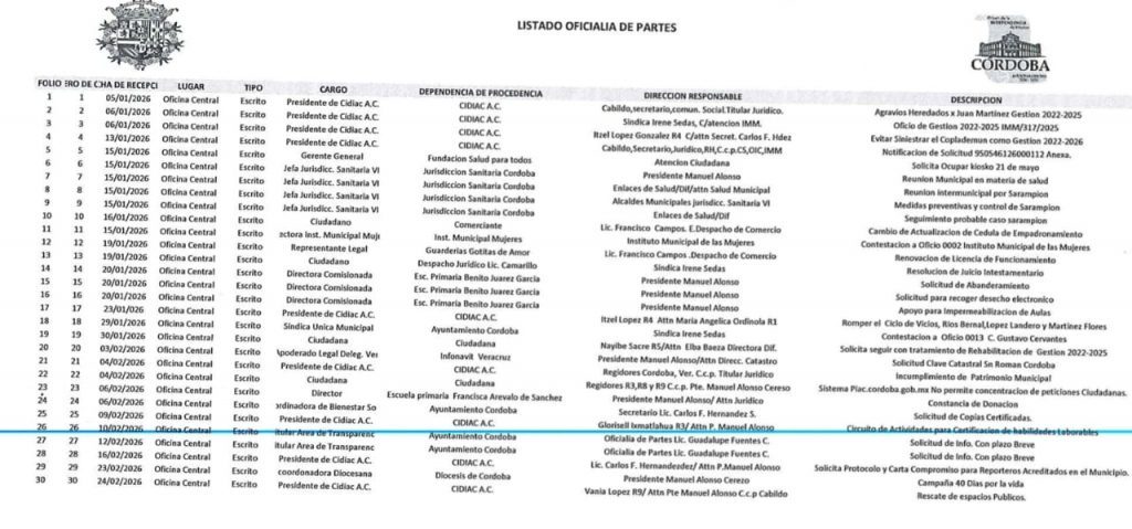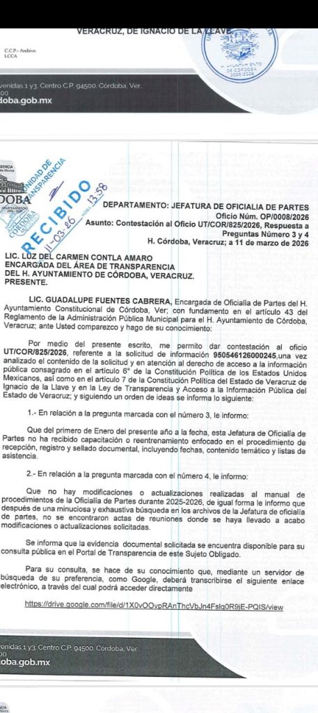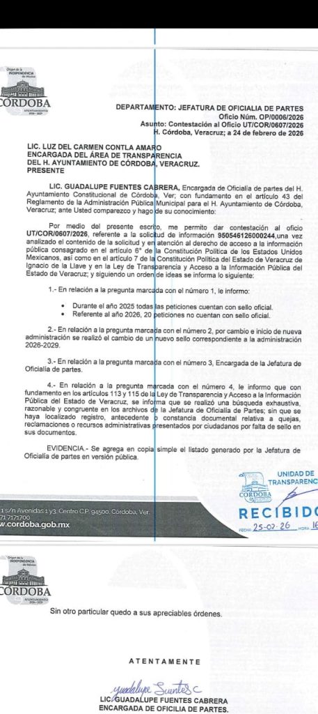 El Ayuntamiento de Córdoba confirmó que durante 2026 al menos 20 documentos ingresaron a la Oficialía de Partes sin el sello oficial de recepción. La información consta en el oficio OP/0006/2026, firmado por la encargada del área, Guadalupe Fuentes Cabrera, en respuesta a la solicitud de acceso a la información con folio 950546126000244.