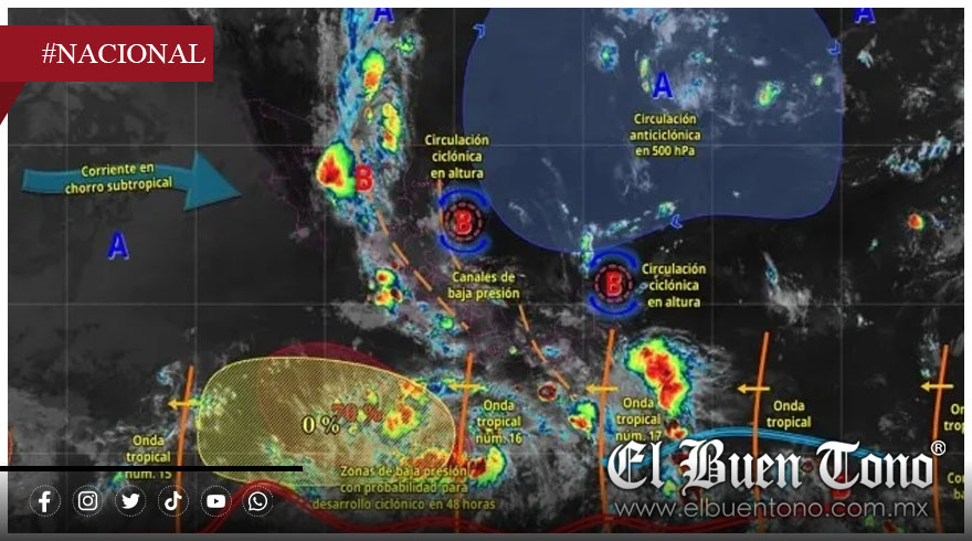 Nacional.- Este martes 29 de julio, el Servicio Meteorológico Nacional (SMN) informó que la onda tropical número 16 y la aproximación de la número 17 provocarán un aumento significativo en las lluvias, vientos fuertes y oleaje elevado en diversas regiones del país.