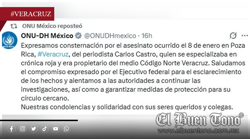 Veracruz.- El asesinato del periodista Carlos Leonardo Ramírez Castro, ocurrido en el norte de Veracruz, generó una reacción de la Oficina en México del Alto Comisionado de las Naciones Unidas para los Derechos Humanos (ONU-DH), que expresó consternación por el crimen y llamó a garantizar una investigación efectiva, así como medidas de protección para su entorno cercano.