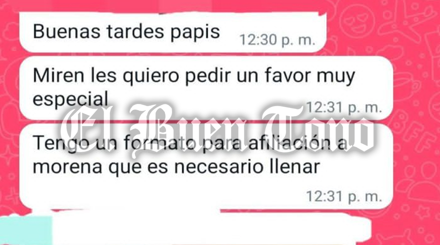 La denuncia que exhiben los padres de familia, es un formato de afiliación al Movimiento de Regeneración Nacional (Morena) y señalan son las maestras del centro escolar, quienes están solicitando a los padres de familia la credencial de elector para afiliarlos en vísperas de la renovación de la estructura de Morena en este municipio.