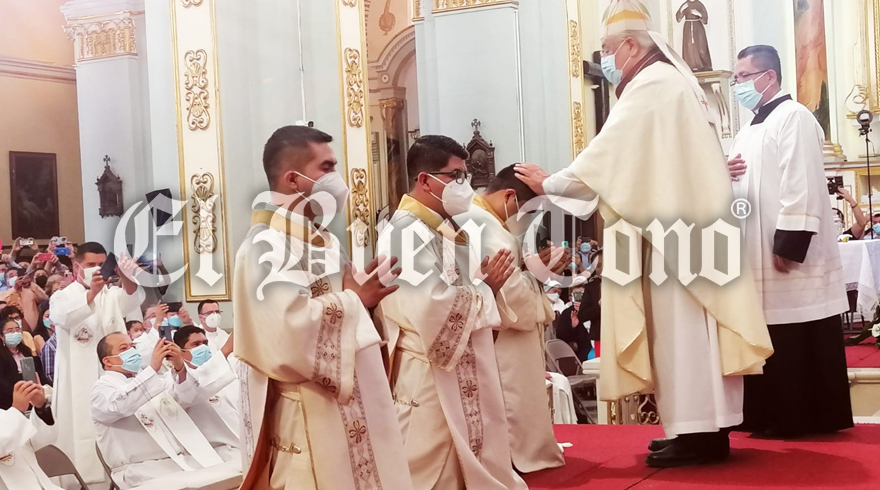 Con la imposición de manos, Monseñor Eduardo Carmona Ortega, les confirió la unción de presbíteros a los diáconos: Manuel, Jorge, Francisco, por su parte el seminarista fue confirmado Diácono Transitorio un escalón antes del sacerdocio.