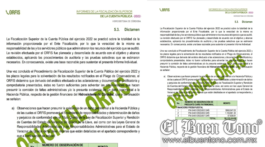 Córdoba. – De acuerdo al informe presentado por el Órgano de Fiscalización Superior del Estado (ORFIS), se dictaminó un presunto Daño Patrimonial en la cuenta Pública 2022, por un total de 2 millones 112 mil 414.98 pesos en la paramunicipal Hidrosistema de Córdoba.