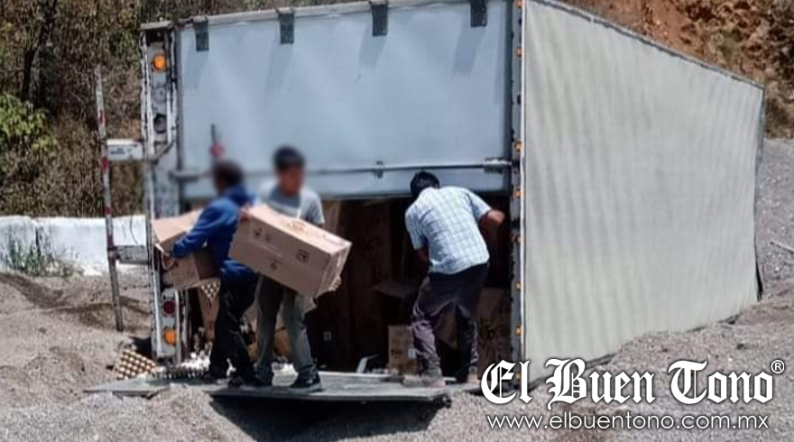 Después del accidente, la gente ratera llegó al lugar y, utilizando una barreta, forzaron los candados de la caja del tráiler para robar la mercancía. Posteriormente, se llevaron en camionetas las cajas de huevo.
