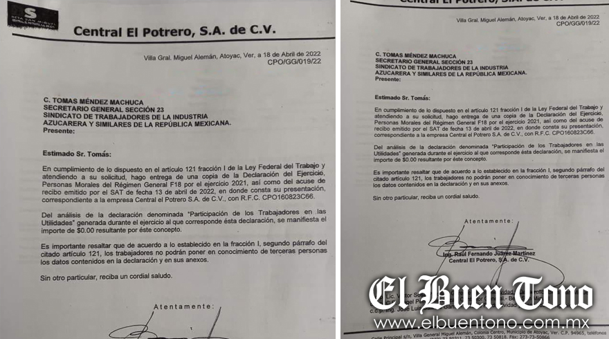 Mediante un oficio firmado por Raúl Fernando Juárez Martínez, representante del Central El Potrero informó que nuevamente no dará utilidades a los obreros de la Sección 23 del Sindicato de Trabajadores de la Industria Azucarera y Similares de la República Mexicana (STIASRM), luego de que la carátula del ejercicio fiscal 2021 se encuentra en ceros.