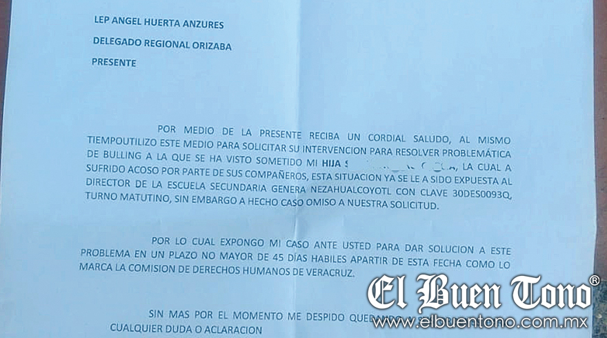 Mariano Escobedo.- Una menor de edad, que acude a la secundaria general “Nezahualcóyotl”, de la unidad habitacional Palmira, es víctima de bullying, sin que el director del plantel ni el delegado de la SEV en Orizaba, hagan algo para frenar el problema, aun cuando ya fueron informados a través de un oficio.
