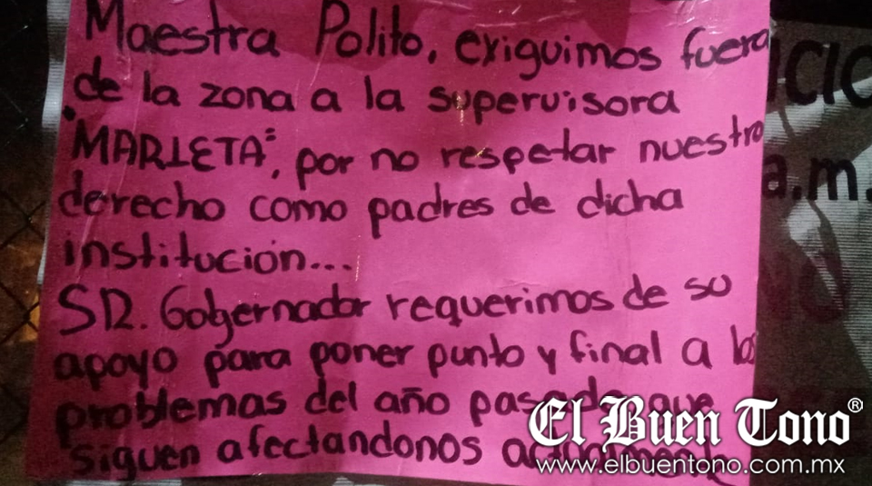 Con pancartas colocadas durante la madrugada de este jueves en el portón del plantel, los quejosos exigieron la destitución de la supervisora de la zona, la maestra “Marleta”, acusándola de no respetar los derechos de los padres de familia.