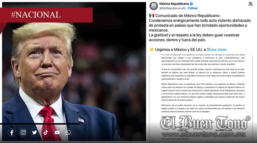 Ciudad de México. — El Partido México Republicano, organización política que busca obtener su registro nacional ante el Instituto Nacional Electoral (INE), ha generado polémica tras expresar públicamente su apoyo al expresidente de Estados Unidos, Donald Trump, y a las recientes redadas contra migrantes mexicanos en Los Ángeles, California.