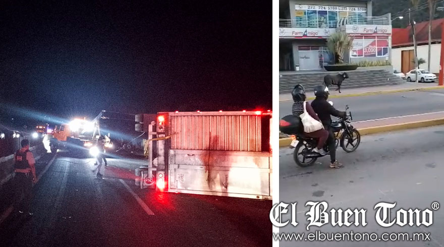 Huiloapan.- La madrugada de ayer se registró un accidente en la autopista Puebla-Córdoba en el que un tractocamión que transportaba ganado vacuno volcó en el kilómetro 276 + 100, dirección Puebla.