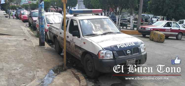 Tezonapa.- En mal estado se encuentran las patrullas de la Policía municipal, autoridades las aparcan en pleno centro durante días sin que las reparen y utilicen para monitorear la zona o hacer rondines, con el objetivo de cuidar la integridad de los habitantes.