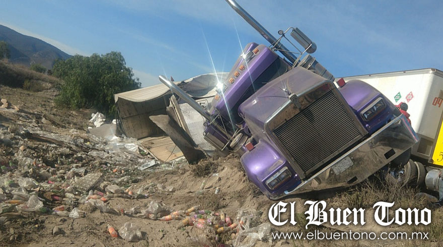 El vehículo marca Kenworth Kenmex de color morado, con placas de circulación 399-WP-7 del SPF iba cargado con bebidas.