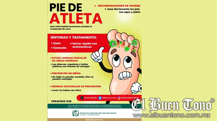 El Instituto Mexicano del Seguro Social (IMSS) en Veracruz Sur exhorta a la población a mantener los pies con buena higiene, para evitar contagiarse de pie de atleta, enfermedad que incrementa durante la temporada de calor.