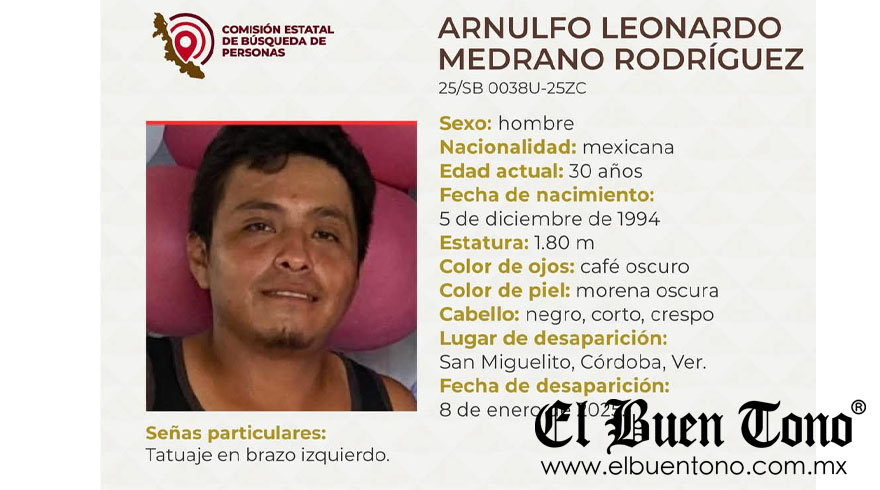Córdoba, Ver.- Un individuo identificado como Arnulfo Leonardo Medrano Rodríguez, de 30 años de edad, esta desaparecido desde el día miércoles 8 de enero del presente año.