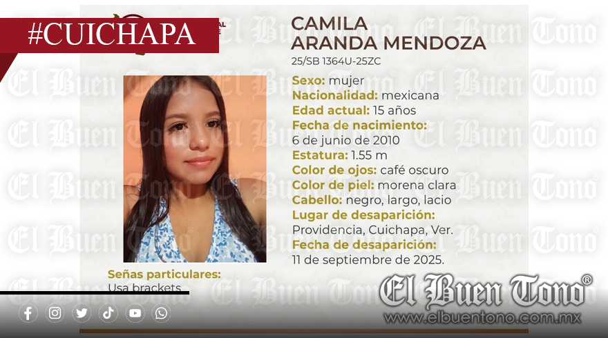 Camila Aranda Mendoza, vecina de la congregación Providencia, esta reportada como desaparecida desde el día de ayer 11 de septiembre.