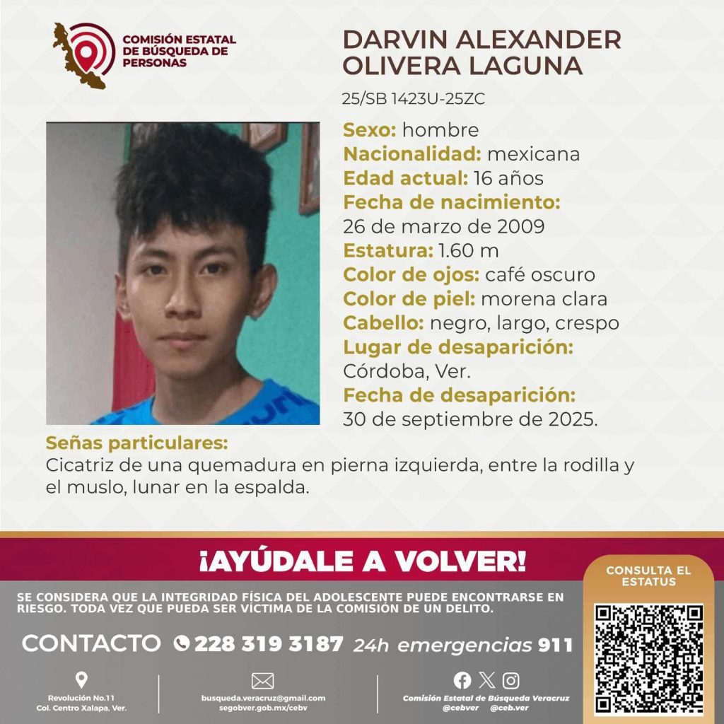 Córdoba, Ver.- Darvin Alexander Olivera Laguna, de 16 años de edad, esta reportado como desaparecido desde el día 30 de septiembre del presente año.