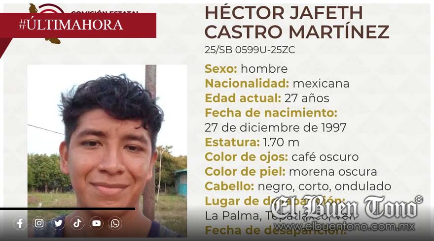 Tepatlaxco, Ver.– Un joven identificado como Héctor Gafeth Castro Martínez, de 27 años de edad, vecino de La Palma, está reportado como desaparecido desde el día 27 del presente mes.