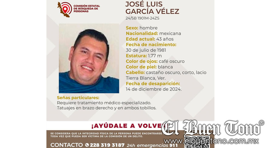 José Luis García Vélez, de 43 años de edad, es buscado por sus familiares ya que desde el sábado 14 no ha sido localizado.