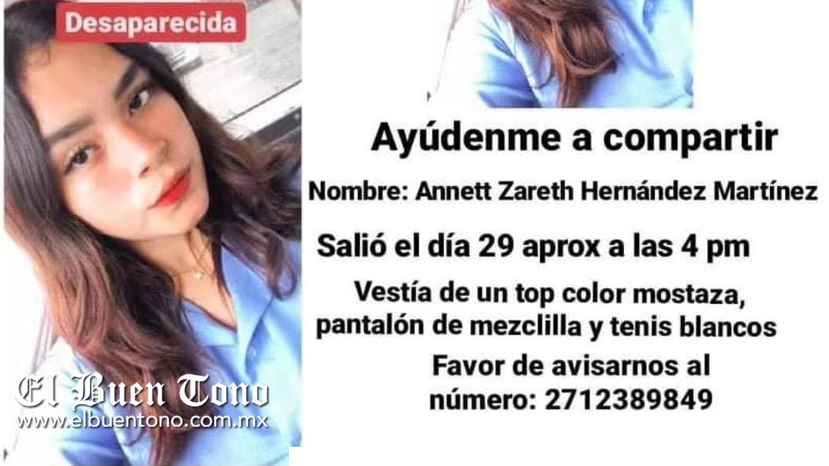 Córdoba.- La joven Annett Zareth Hernández Martínez, es boletinada a través de los diferentes grupos de Facebook y WhatsApp, debido a que se encuentra en calidad de desaparecida tras haber salido de su domicilio, la mañana del pasado día 29 y hasta el momento perdieron todo tipo de comunicación con ella.