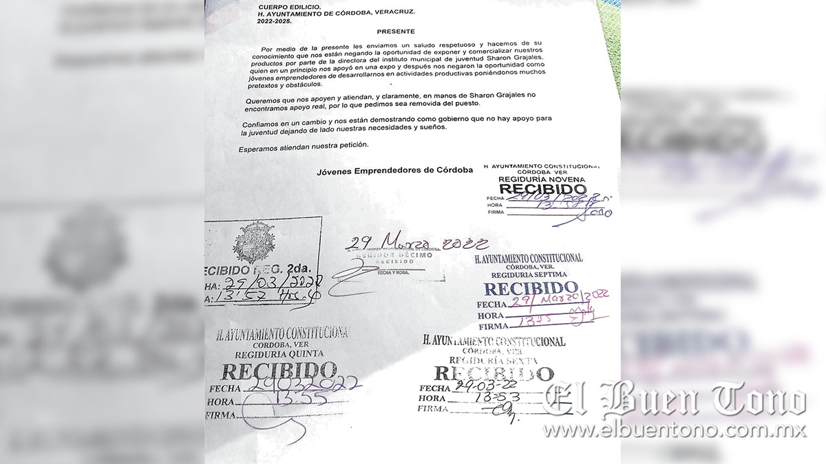 CÓRDOBA.- Ante este medio de comunicación Jóvenes Emprendedores dieron a conocer un documento en el que solicitaron por escrito la destitución de la directora del Instituto Municipal de la Juventud, Sharon Grajales.