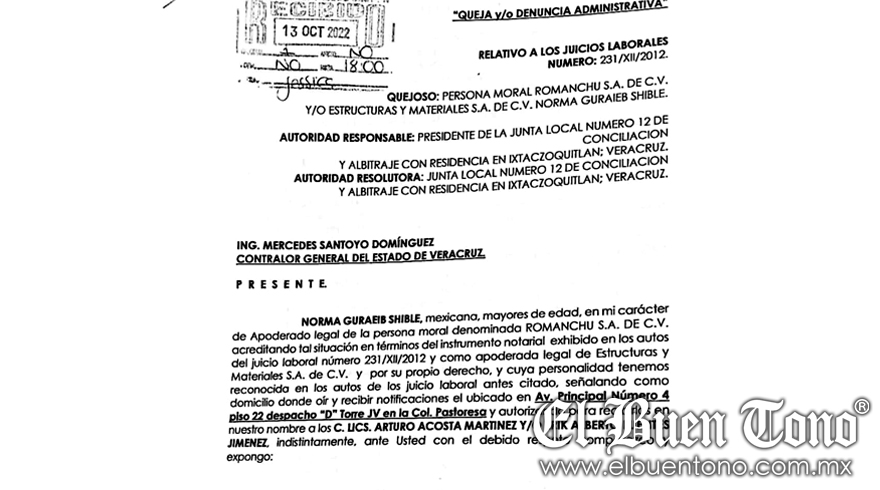 Esta queja o denuncia administrativa fue presentada el jueves 13 de octubre en la Contraloría General del Estado, derivado del Juicio Laboral número 231/XII/2012 por el quejoso persona moral Romanchu SA de CV, Estructuras y Materiales SA de CV, Norma Guraieb Shible y se hizo la queja ante la contralora general del estado, Mercedes Santoyo Domínguez.