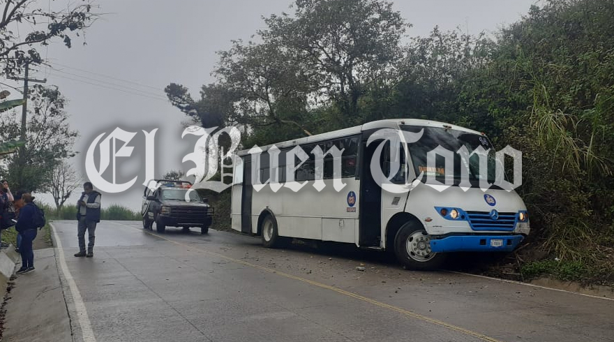 Tomatlán.- Un autobús de pasajeros chocó contra un cerro durante la mañana de este miércoles al momento de que el conductor perdió el control y derrapó al momento de circular sobre la carretera Ixhuatlán del Café- Tomatlán, a la altura del lugar conocido como Las Compras.