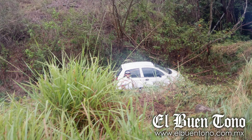 Atoyac.- Un vehículo Chevrolet-Matiz terminó en un barranco, cuando circulaba sobre la carretera estatal Paso del Macho-Atoyac, a la altura del lugar conocido como Buenos Aires, cerca de la curva del río el Chiquihuite.