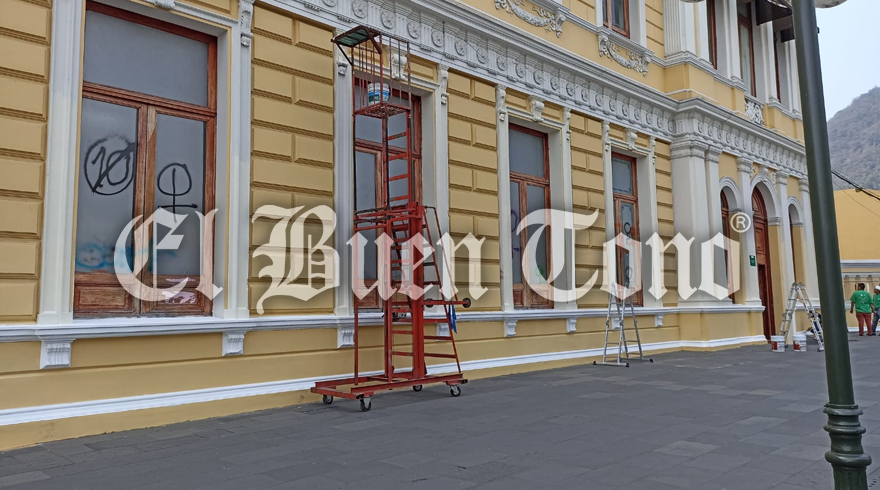 Orizaba.- Una cuadrilla de trabajadores del ayuntamiento de Orizaba realizó labores de pintura a la fachada del palacio municipal de esta ciudad, tras actos vandálicos.