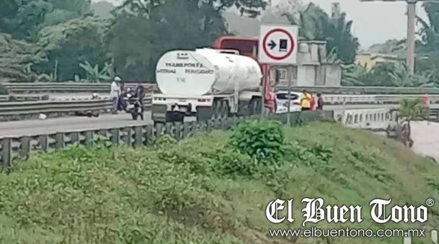Ixtaczoquitlán.- Un accidente ocurrió la tarde de ayer domingo en la autopista Orizaba-Córdoba, a la altura de Sumidero, involucrando a una pipa y un vehículo particular.