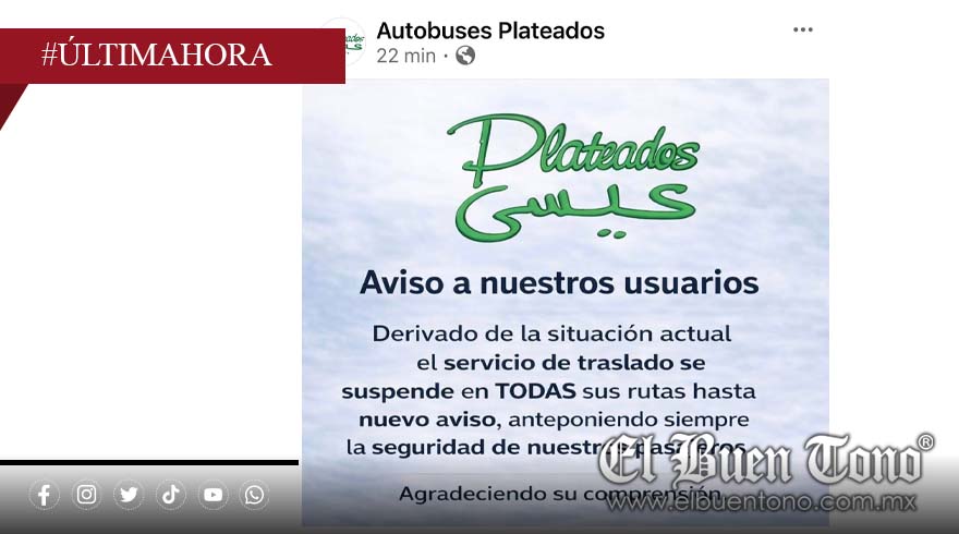La empresa Plateados informó a sus usuarios que, debido a la situación actual, el servicio de traslado queda suspendido en todas sus rutas hasta nuevo aviso. La compañía destacó que la medida busca priorizar la seguridad de los pasajeros y agradeció la comprensión de quienes utilizan sus servicios.