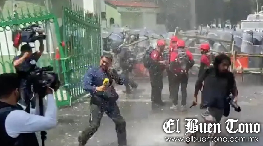 Elementos de la Policía Militar que resguardan las instalaciones, con una tanqueta lanzaron chorros de agua para dispersar a los civiles, incluyendo a los trabajadores de la prensa que se encontraban en el lugar; las escenas fueron captadas por reporteros, fotoperiodistas y camarógrafos que cubrían la protesta.