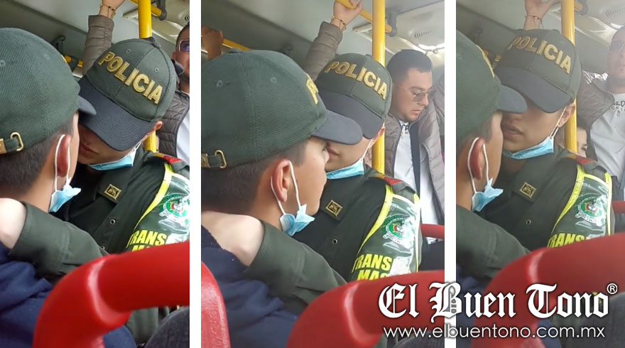 Una pareja de policías fue grabada mientras protagonizaban un romántico momento arriba de un autobús del transporte público.