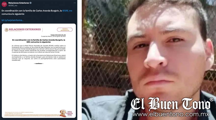 “Se informa que la Real Policía Montada de Canadá [RCMP] notificó sobre la localización de un cuerpo, en las orillas del lago Osoyoos, con la vestimenta con la que Carlos Tomás Aranda Burgoin fue visto por última vez el 7 de julio de 2023”, se reveló en el comunicado.
