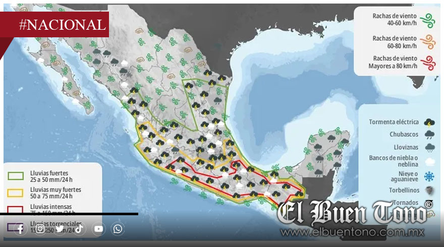 También se pronostican rachas de viento de 40 a 60 kilómetros por hora (km/h) en el noroeste, norte y sureste del país, incluyendo la Península de Yucatán, con posibles tolvaneras en Baja California, Sonora, Chihuahua, Coahuila, Nuevo León y Tamaulipas.