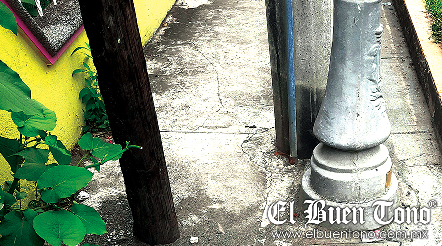 Cuitláhuac.- Los postes en las banquetas restringen el paso y exponen a los ciudadanos a sufrir un accidentes o caerse, especialmente en el caso de los adultos mayores, pero el presidente municipal, Martín Rico, ni cuenta se da del problema, denunciaron habitantes afectados.