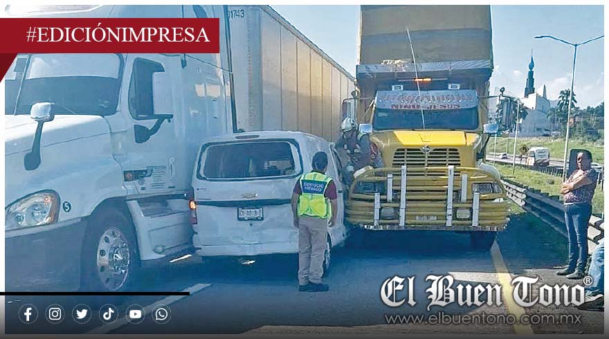 El accidente se registró al momento en que un torton de color amarillo impactó a una camioneta, de color blanco, la hizo girar, la empujó más de 20 metros y la prensó contra un tractocamión con caja seca atorado en el caos.