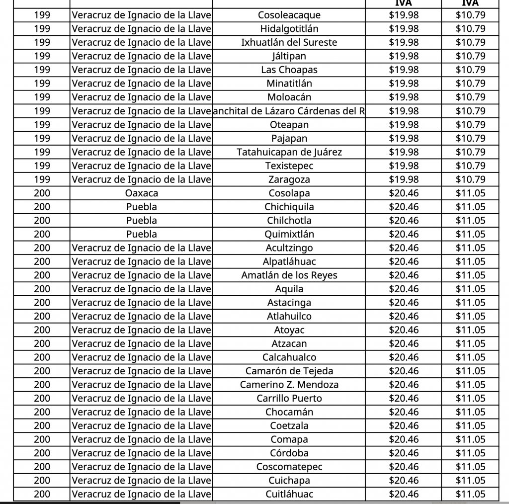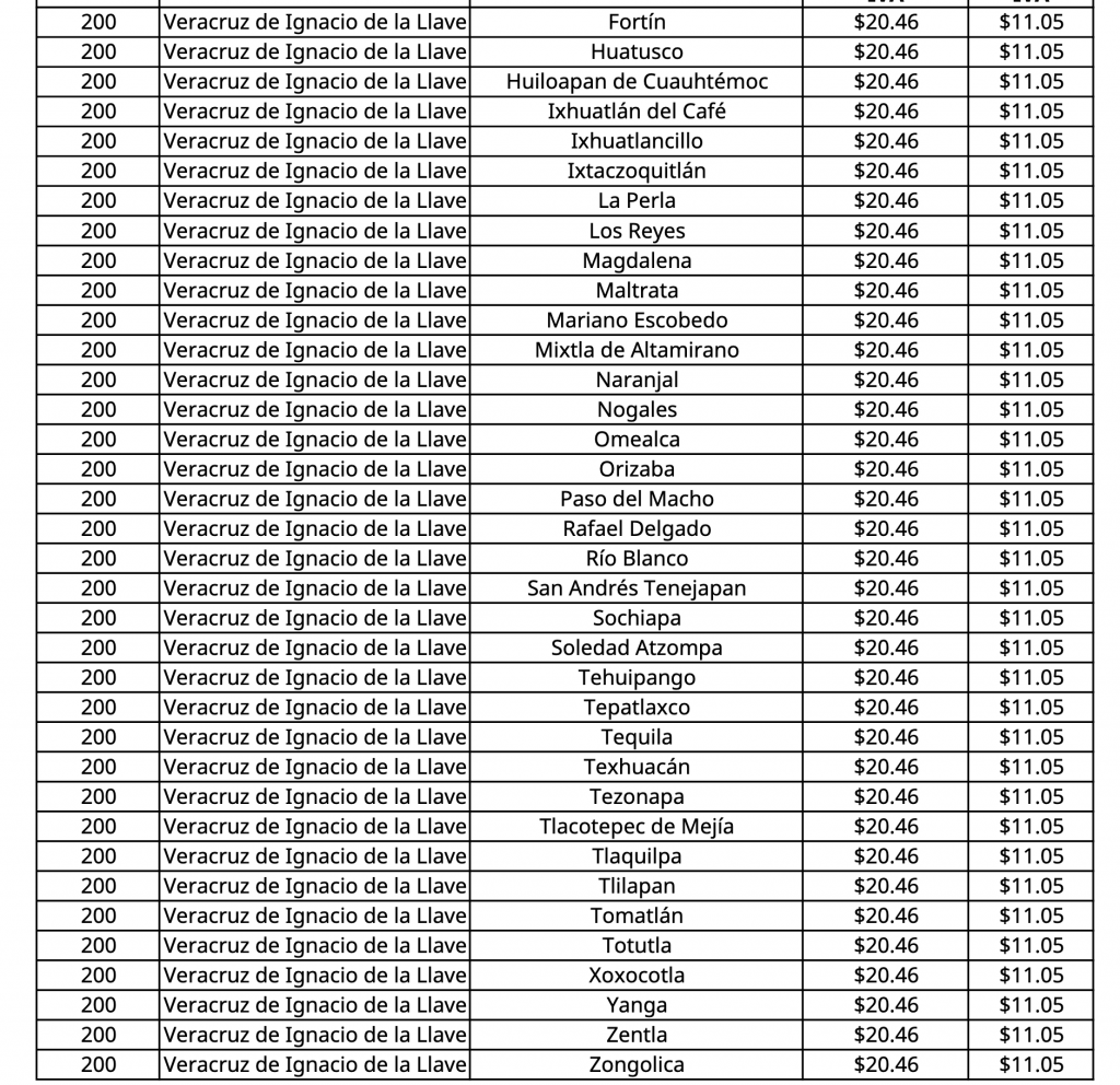 La lista completa de precios por entidad y municipio puede consultarse a través de los canales oficiales, donde se detallan las tarifas específicas aplicables en cada zona del país durante este periodo.