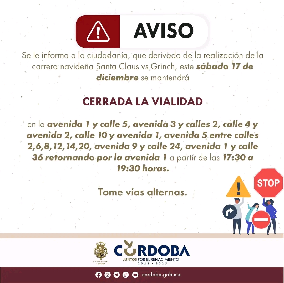 Córdoba.- A partir de las 17:30 a las 19:30, las principales calles y avenidas de esta ciudad, estarán cerradas debido a la carrera navideña, la cual recorrerá las arterias más importantes.